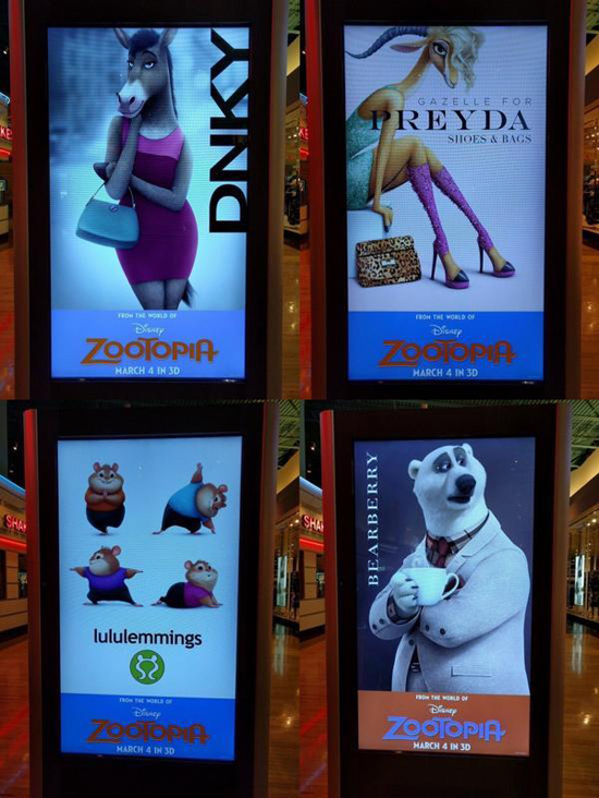11、动物世界里大部分出现的牌子都能和现实生活中真实存在的品牌对应的,比如以下这张:分别山寨DKNY,PRADA,lululemon和Burberry;