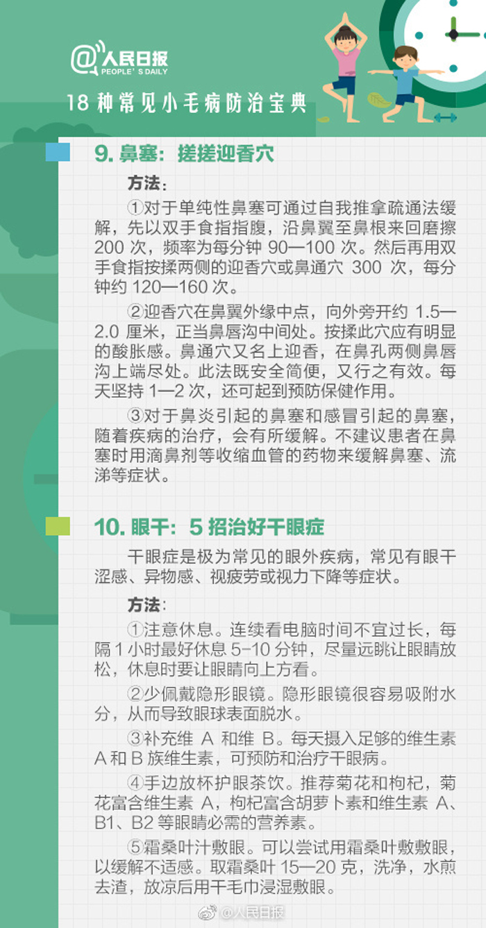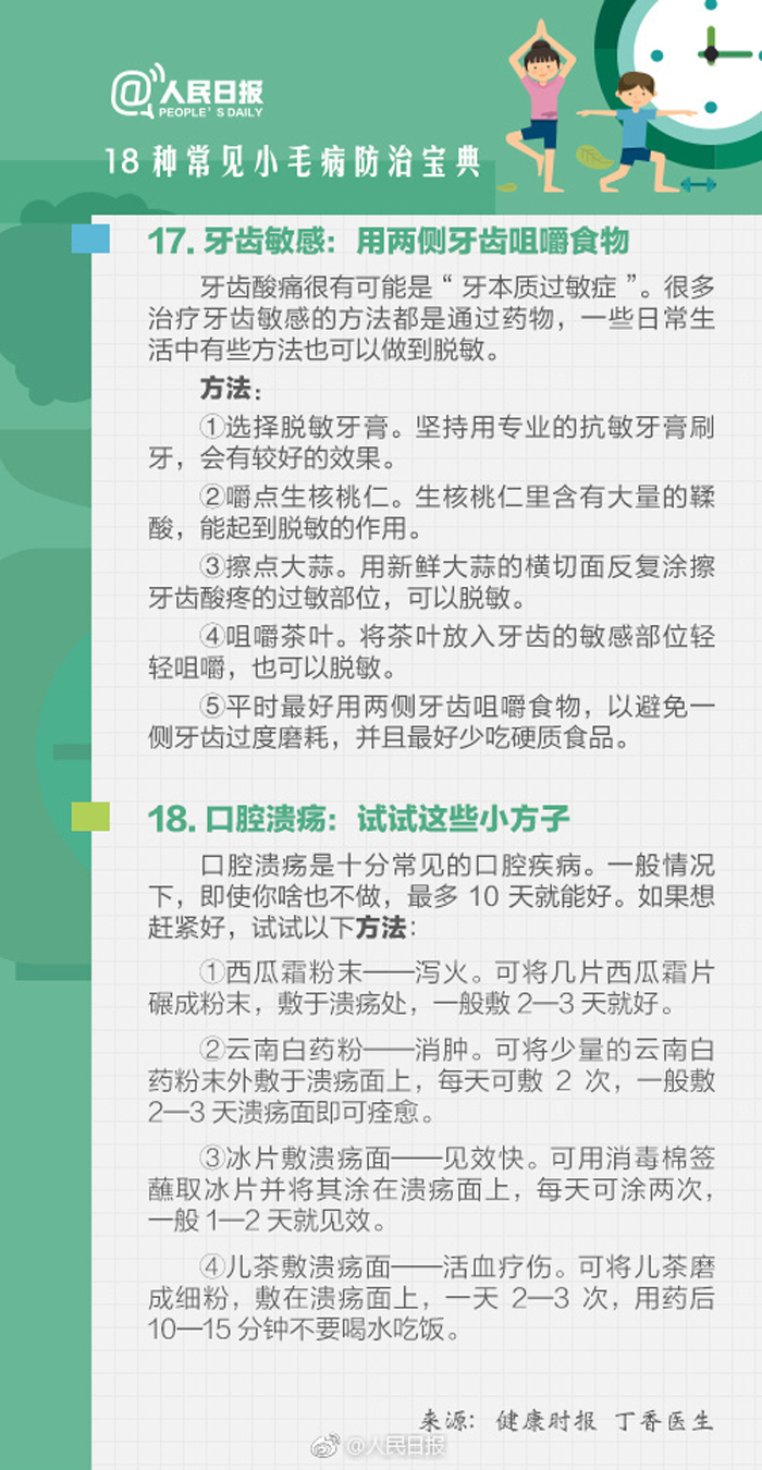 生活节奏快、工作压力大,身体难免出现些小毛病,可总往医院跑也不现实。想要小病不求人?送你18种常见小毛病治疗方法!感冒发烧38.5℃以下尽量先物理降温,皮肤过敏切勿用热水或面膜去刺激,长倒刺要用剪刀剪不能用手撕……为了家人的健康,学起!