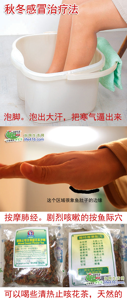 【加国生活网】这几天小编的两个好友都得了重感冒,症状相同:剧烈咳嗽,噪子特别痛。小编和她们说,季节变换得感冒,大多都是由寒凉引起的风寒感冒,赶紧排寒气吧。一是晚上泡泡脚,泡出大汗为止,这是排寒气的好办法;二是按摩一下肺经,如果咳嗽特别厉害的话,要多按鱼际穴;三是多喝些止咳花茶,都是天然的;四是防止病毒传染到全家,做好杀菌工作(可使用精油做成空气清新剂杀菌,或是香薰)。