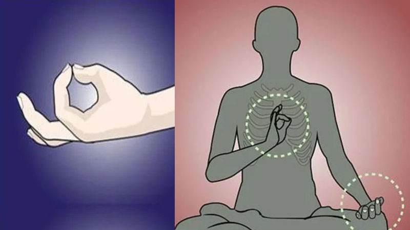 1、盘腿坐下后,依照上图结手印(右手的食指和拇指相抵,形成一个圆放置在胸部,左手做同样动作,搭在左膝上)。