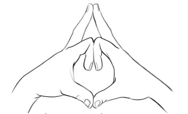 1、盘腿坐下后,依照上图结手印(双臂抬起,将两手拇指和小指直立并两两相触,两手的其他手指在指节处弯曲并两两相触,两两相触的拇指指向眉心中央)