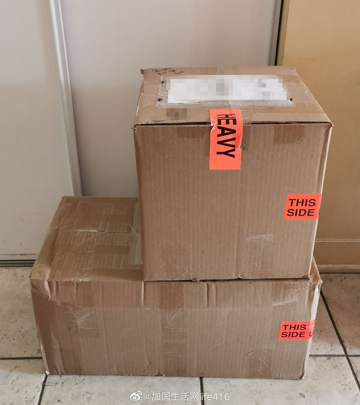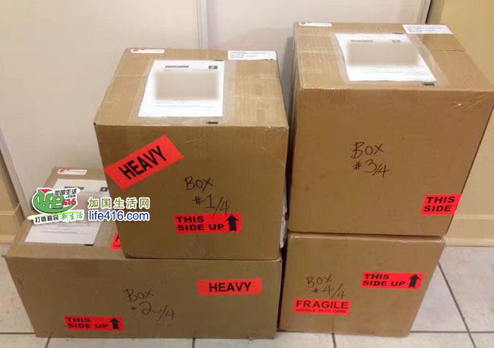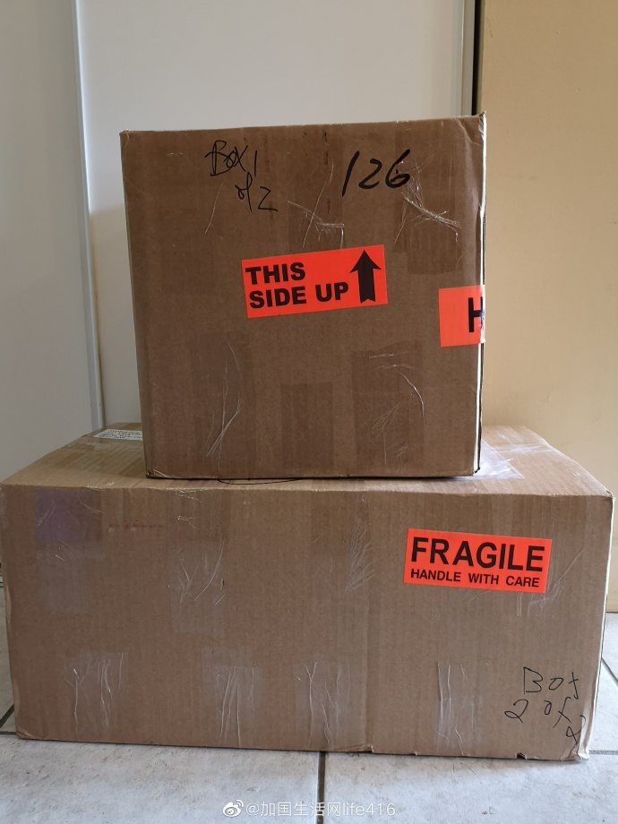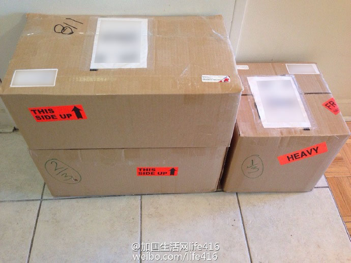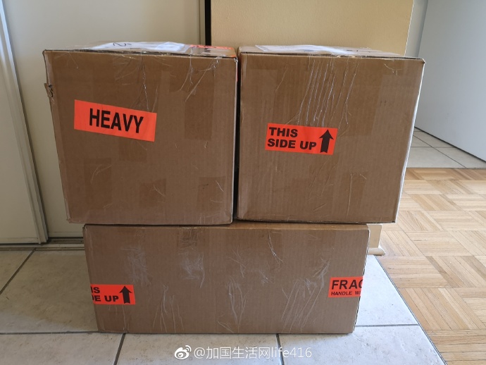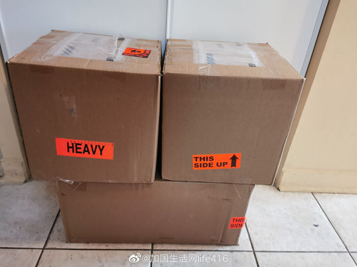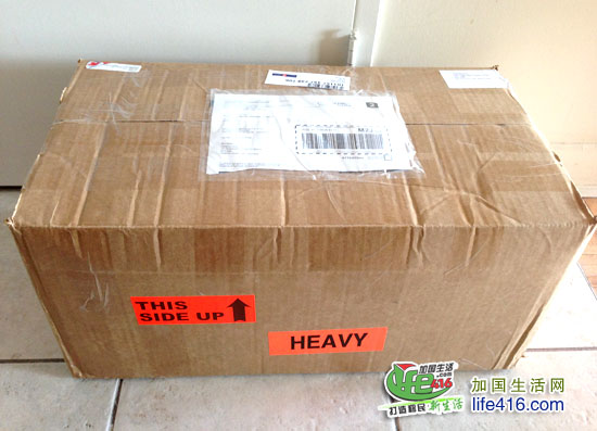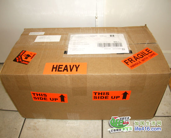 Canada Post 的工作人员是推着个小车送货上门的,他直说:“这个箱子很重哟”,下一个眼神就是“你都买了些什么东东”。你看那上面标着是“HEAVY”的大标签就知道这个箱子有多重了,要知道,里面是三四十瓶水哟,能不重吗,呵呵。