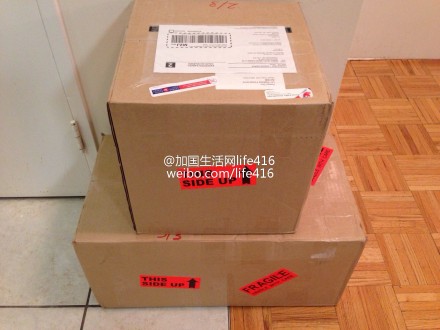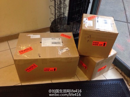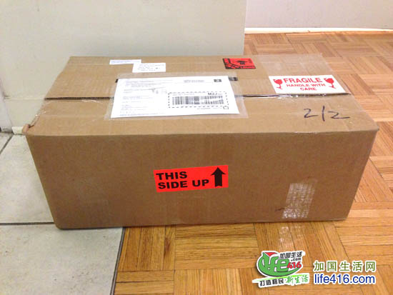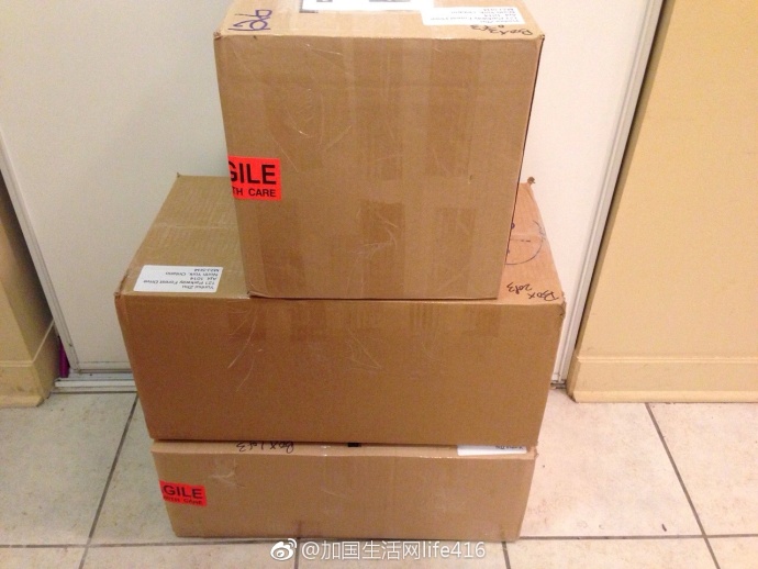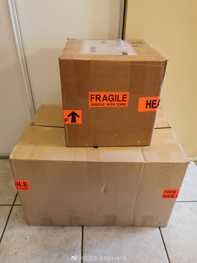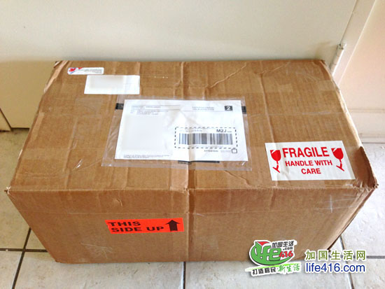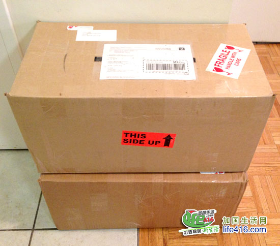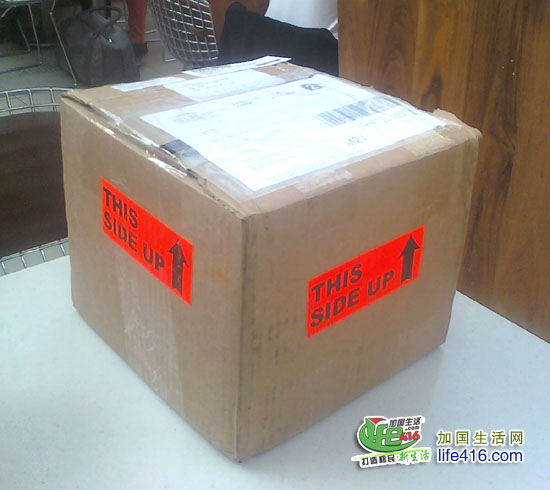 今天小编接到邮件说是Canada Post试着投递未能成功,让小编自己到邮局去取。Canada Post的人干活实在不认真,邮箱里也没给小编留取货单,小编只能上网把送货流程打印下来作为证明,并带着个壮劳力(小编老公哈),亲自到邮局去取这两个大箱子,并满头大汗地搬了回来,开箱验货。
