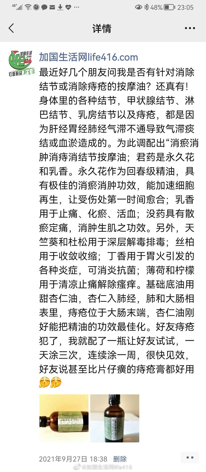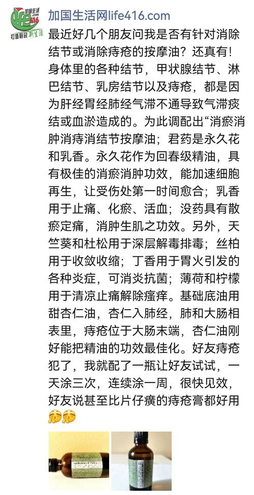 2024年2月28日:上次回国的时候,小编给老爸留了一瓶消瘀消肿消结节消痔按摩油,让他按摩全身。老爸说他用来按摩心脏,感觉很舒服,用得很快,已经用完了。这次小编专门给老爸配了一大瓶250ml的,在消瘀消肿消结节按摩油的基础上,额外多加了乳香和马郁兰精油,着重加强了针对心脏的精油,用来滋养心脏。2024年至2027,天地之间火的力量会越来越旺,会引发心脑血管疾病,老年人更是要要保护好心脏哟。自古以来,乳香精油被视为世界上最珍贵的精油之一。乳香精油具有多重效用,包括抗肿瘤、抗癌、抗衰老、抗抑郁、抗炎症、化痰、激发免疫力和镇静等,是有效的肺部杀菌剂。当您不知道选择什么精油时,选择乳香一定不会错。乳香配合其它精油使用时都有加倍提升功效的作用。受影响的身体系统:情绪平衡、免疫和神经系统、皮肤。|| 马郁兰精油是心脏的补药,能降低高血压。它的放松效果有助于改善头痛、偏头痛和失眠。马郁兰在安抚消化系统的效果相当闻名,有益于胃痉挛、消化不良、便秘、胀气,不能帮助身体排除毒素,并有益于胸腔传染病及感冒、鼻窦炎、支气管炎与气喘。在感冒时,能消除头脑的窒塞感,还能调节月经周期,减轻痛经。