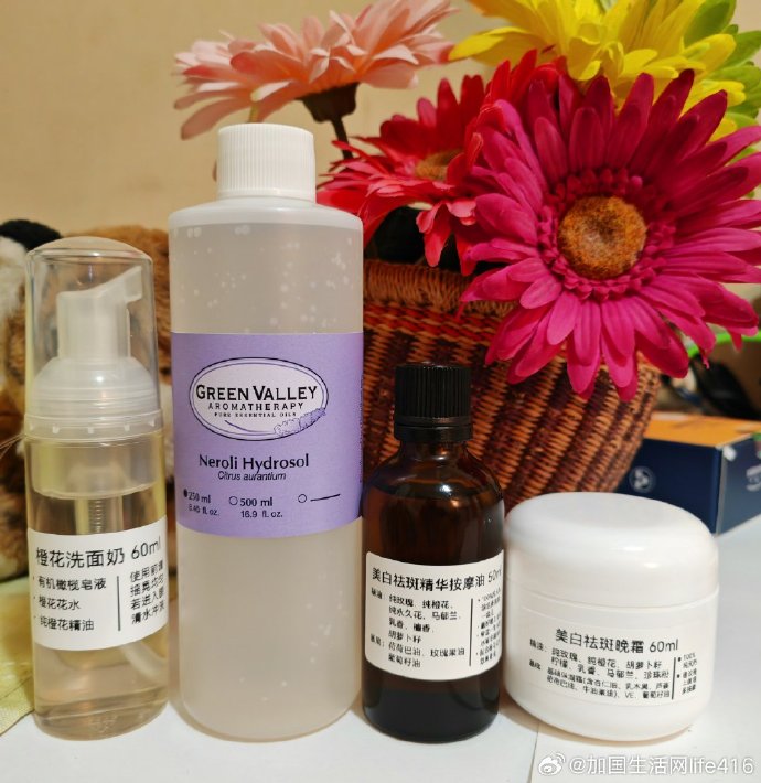 橙花系列还可以再搭配一瓶美白祛斑精华按摩油(右二)