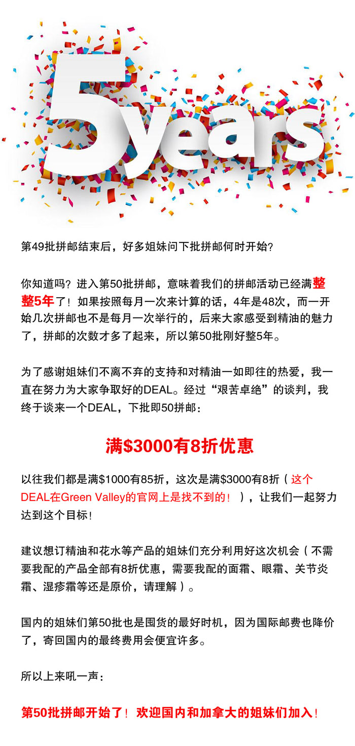 拼邮的流程:Green Valley 是加拿大著名的精油品牌,总部在温哥华,所以在多伦多的小编才组织拼邮来着。小编得到的DEAL 是满$1000有15% OFF的优惠,再加上大家一起拼邮,从温哥华寄到多伦多的邮费$17平分(邮费从2024年5月1日起涨价至$17),所以这个拼邮的DEAL是相当合算的,在Green Valley 的网站上是找不到的。小编先统一大家的订单,超过$1000后就去GV网站下订单,下完订单后会告诉每个人的具体费用(因为这时人数已经确定,所以就知道每人平分的邮费是多少了)。一个星期左右货就会寄到,小编会联系大家过来取货,就在FAIRVIEW MALL或附近的地铁站见面取货,请大家在取货前EMT。所以,如果你订了货就必须要的,不能不要了,因为小编先用信用卡付款的。现在拼邮人多,要求货到一个星期内尽快来取货。另外,如果你已经怀孕的话,就请不要考虑拼邮了,因为有些精油不太适合怀孕的女人使用,小编不是专业人士,也只是组织大家拼邮,以防万一出问题,小编不收孕妇的订单。孕妇姐妹们先就请耐心养胎,生完孩子、哺乳结束后再欢迎加入我们的拼邮队伍。
