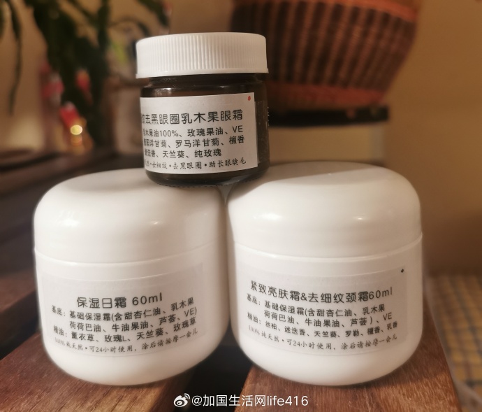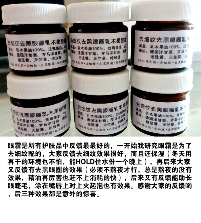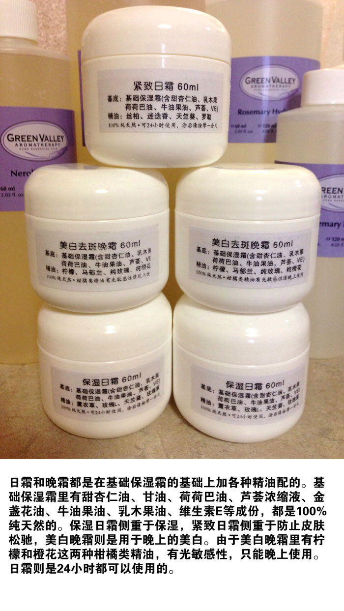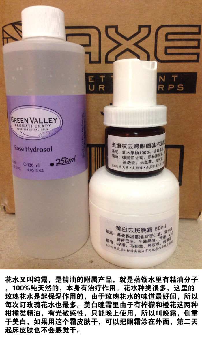 这批拼邮,好几位朋友是这样订的:玫瑰花水做爽肤水或做面膜;保湿日霜白天用;美白祛斑晚霜晚上用;皮肤超级干的,再把眼霜涂外面,在冬天有暖气室内超级干的环境下,第二天早晨起床,皮肤一点也不干,眼角还没有细纹!这就是这套100%纯天然精油护肤保湿系列的魅力所在!!