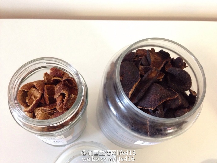 加国生活网小编编后按:有网友问做好的陈皮要如何用?泡茶、做粥、煲汤都可以用,还有网友反馈说把这段时间正在按照加国生活网网站介绍的办法制作“九蒸九晒”陈皮,还只是做到“三蒸三晒”,把“半成品”陈皮放到红烧肉里,味道就很香了,哈哈,是的,“九蒸九晒”陈皮需要好久的时间,可以一开始制作一批“三蒸三晒”陈皮马上使用,或者放一二个月后再使用,再慢慢制作“九蒸九晒”陈皮,再长时间储藏。
