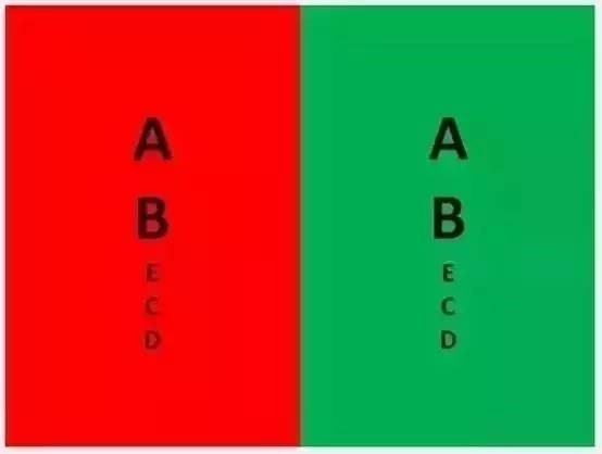 4、老花测试 遮住一只眼看下图, 正常人看到的红绿背景上的字母一样黑。 如果红色字清楚,则是出现近视; 如果绿底字清楚,就是老花眼。