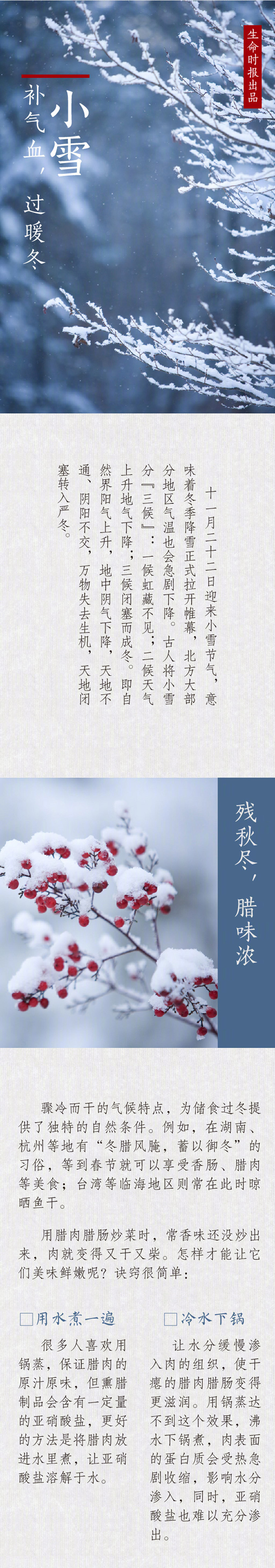 11月22日迎来小雪节气,意味着冬季降雪正式拉开帷幕。古人将小雪分“三候”:一候虹藏不见;二候天气上升地气下降;三候闭塞而成冬。即自然界阳气上升,地中阴气下降,万物失去生机,天地闭塞转入严冬。越冷越要懂养生。