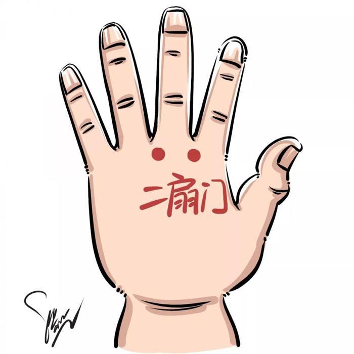 在掌背,中指跟两侧的凹陷中,揉二扇门,100~200次,揉完可以掐5下左右,这个穴位是发汗的特效穴。揉时要稍用力,速度宜快,多用于风寒外感。本法常与揉肾顶、补脾经、补肾经配用,适宜体虚外感者。