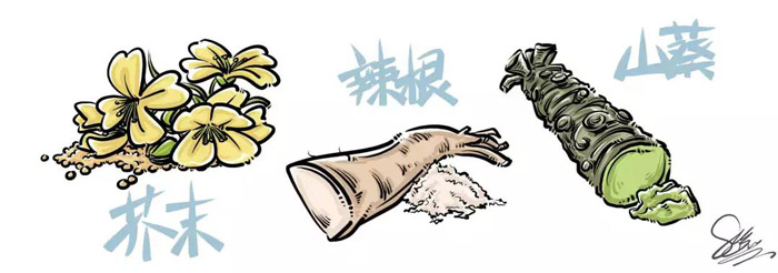 山葵与辣根之所以会被大家误传,都叫了成芥末,是因为他们同属十字花科,都具有与芥末相似的冲鼻气味。与他们不同的是芥末的刺激气味来源于果实——白芥子,而山葵与辣根均为块根。白芥子粉碎并加水之后,其中含有的芥子硫苷和芥子酶发生水解反应,生成辛辣的异硫氰酸酯类化合物,请记住这个复杂的化学名称,它既是这三种植物刺激气味的来源所在,又是西蓝花、甘蓝等植物“被认为具有抗癌作用”的食物的有效成分所在。