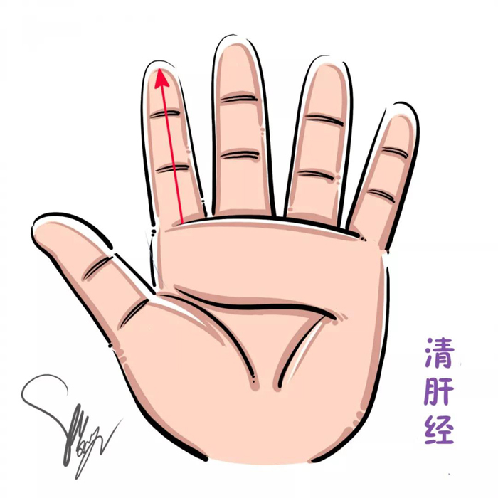 肝经位于小儿食指的掌面指根到指尖,从指根直推向指尖为清肝经,操作200次。