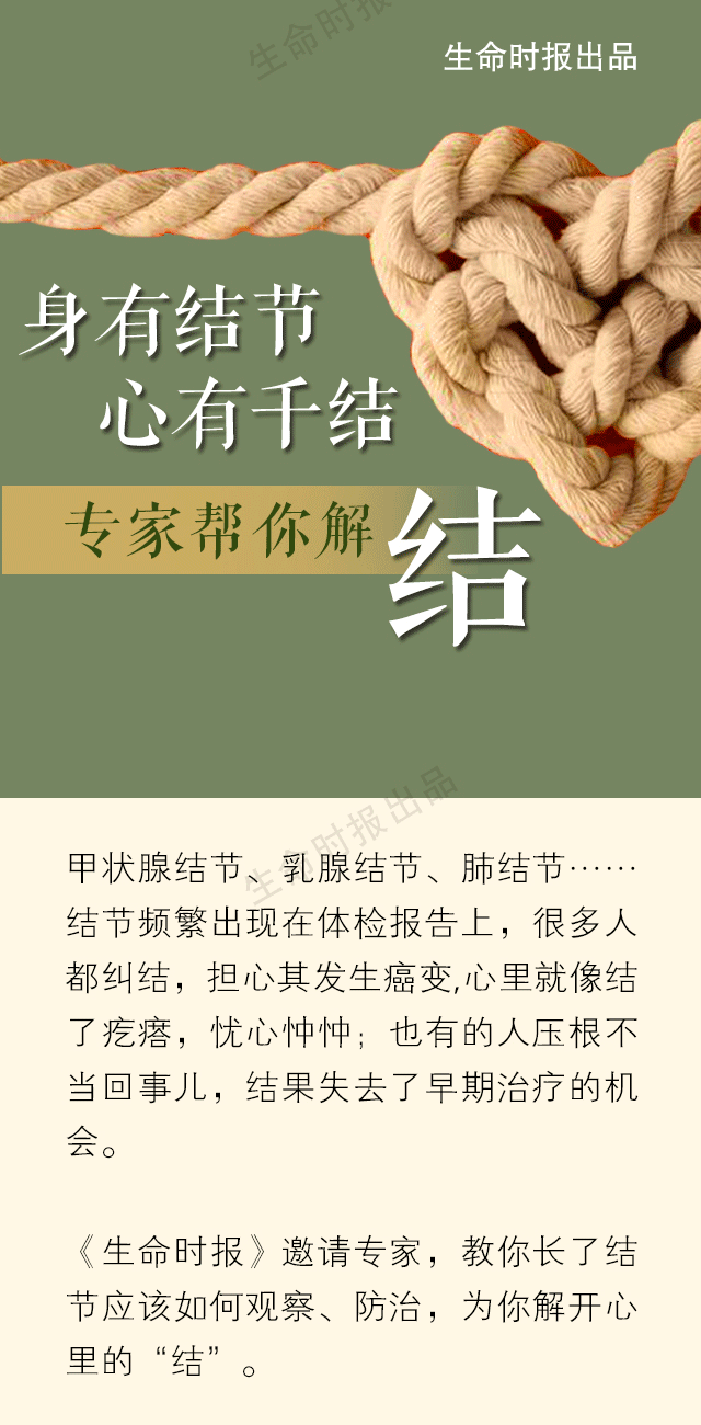 甲状腺结节、乳腺结节、肺结节……结节频繁出现在体检报告上,很多人都纠结,担心其发生癌变,心里就像结了疙瘩,忧心忡忡;也有的人压根不当回事儿,结果失去了早期治疗的机会。《生命时报》邀请专家,告诉你长了结节应该怎么办。