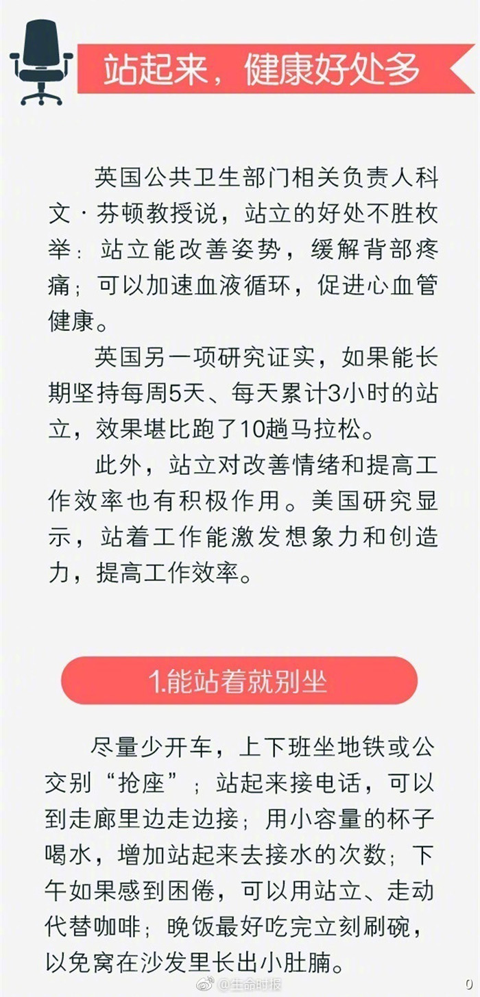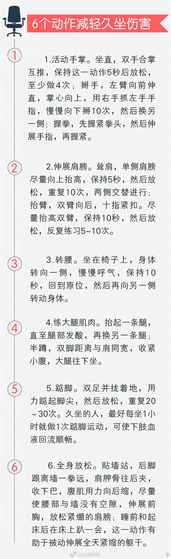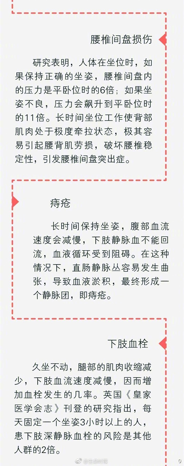 上班8小时坐着,吃饭坐着,聊天坐着,回家看电视坐着……不知不觉,你已经成为久坐族中的一员。久坐带来众多健康问题,如颈部僵硬、腰背酸痛,甚至会缩短寿命。《生命时报》采访权威专家,送上自救指南,助你彻底告别“椅子病”。