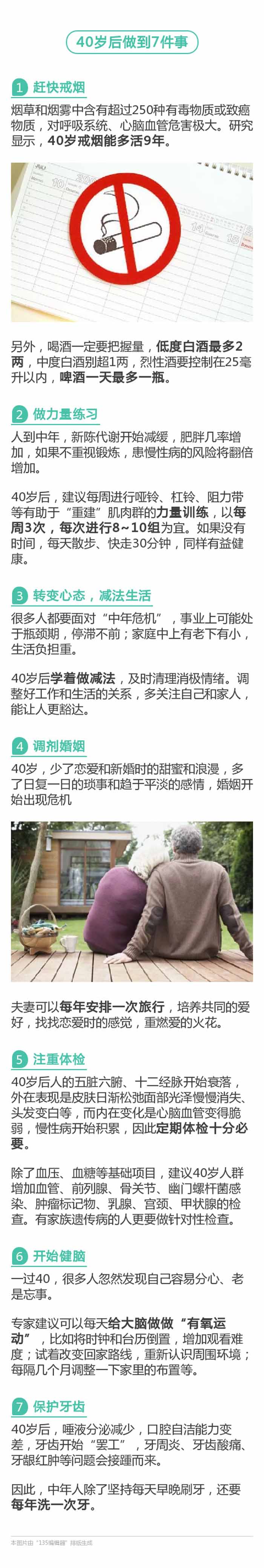 40岁是健康的分水岭。英国《每日邮报》刊登的一项调查显示,到了40岁,近3/4的英国人开始为健康发愁,并后悔年轻时没有养成健康的生活习惯。《生命时报》总结出40岁后的7个长寿习惯,据说能做到的人最后都长寿了。
