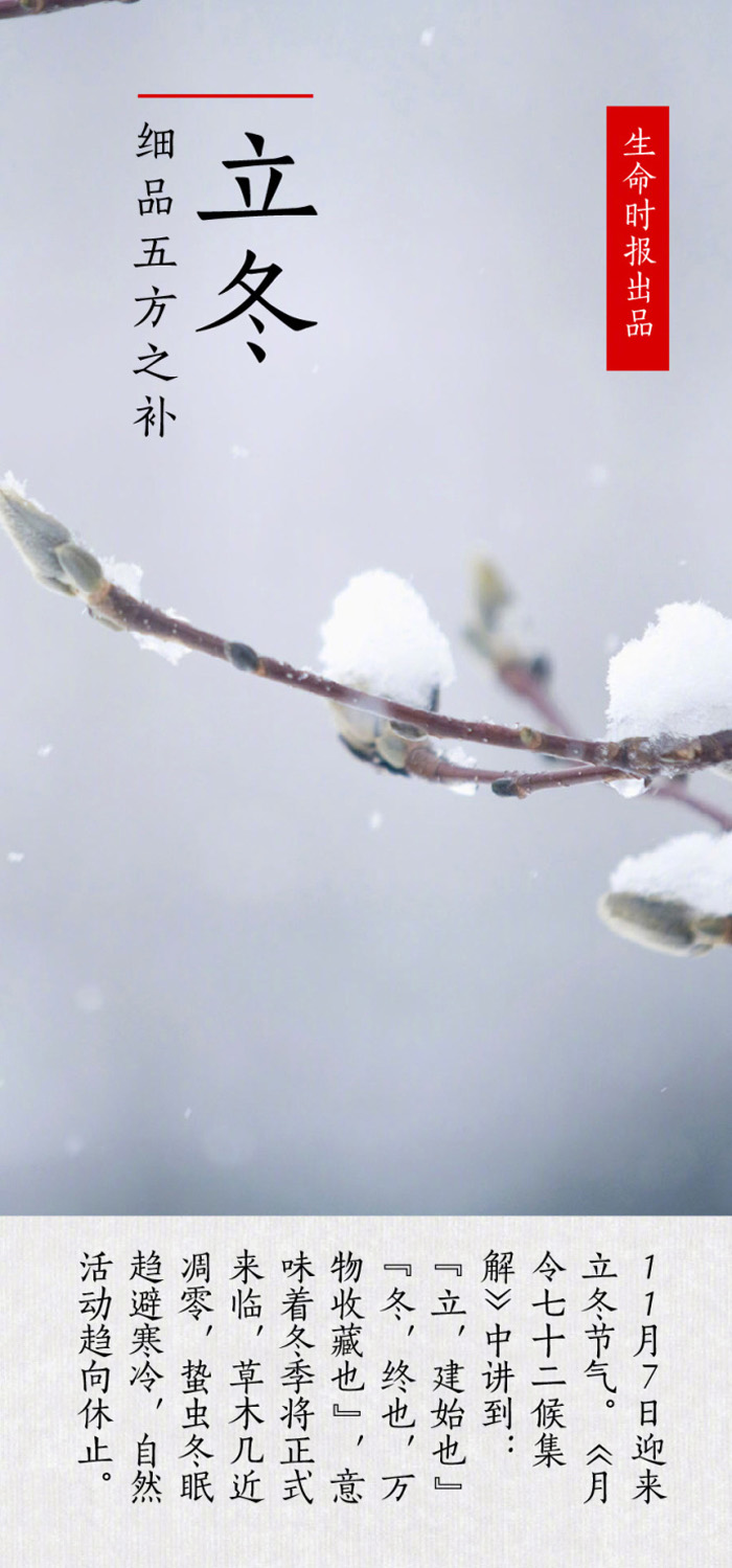 11月7日迎来立冬节气,冬季将正式来临。俗话说“冬季进补,来年打虎”,此时进补能使营养物质及其转化的能量,最大限度地贮存体内、滋养五脏、强健身体。立冬作为冬季进补的开端,养生更要围绕一个“藏”字。