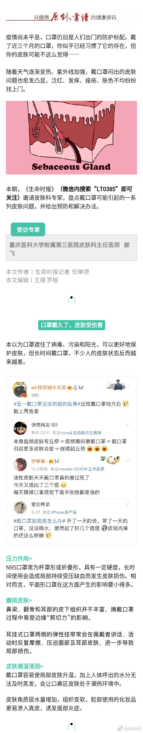 《生命时报》邀请皮肤科专家,盘点戴口罩可能引起的一系列皮肤问题,并给出预防和解决办法。