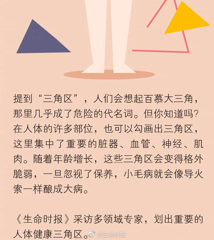 提到“三角区”,人们会想起百慕大三角,那里几乎成了危险的代名词。但你知道吗?在人体的许多部位,也可以勾画出三角区,这里集中了重要的脏器、血管、神经、肌肉。随着年龄增长,这些三角区会变得格外脆弱,一旦忽视了保养,小毛病就会像导火索一样酿成大病。《生命时报》采访多领域专家,划出重要的人体健康三角区。