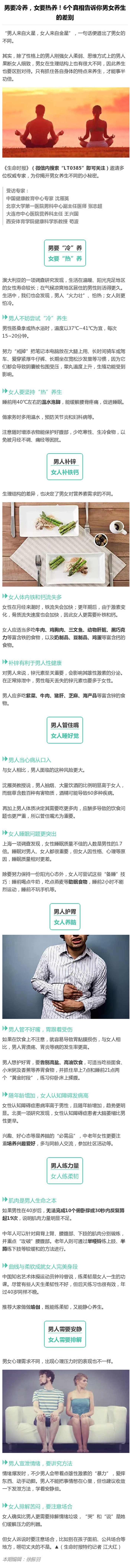 “男人来自火星,女人来自金星”,一句话说出了男女的不同。除了性格、思维方式、生理结构上男女有很大不同,养生也要区别对待。只有抓住各自身体的特点来养生,才能事半功倍。生命君邀请权威专家,用6个真相告诉你男女养生的差别。