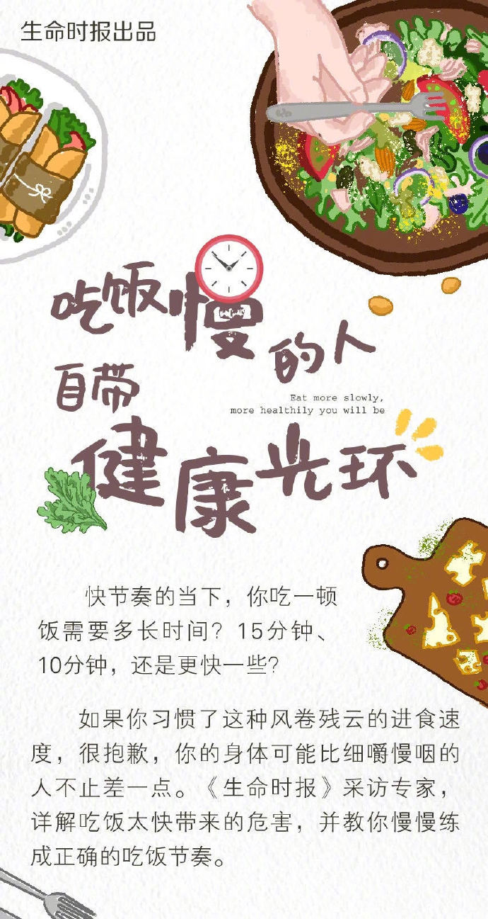 你吃一顿饭需要多久?40多年前,每餐咀嚼900—1100次、用时20—30分钟,而在快节奏的当下,每餐咀嚼500—600次、用时5—10分钟。佟丽娅在《向往的生活》里透露,保持身材的诀窍之一,就是细嚼慢咽。吃饭慢的人不仅更易瘦,还能为身体带来健康好处。