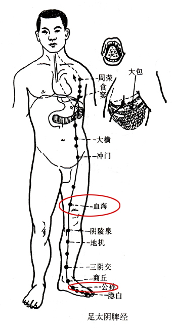 血海穴:屈膝,在髌骨内上缘2寸。男子以气为根,女子以血为本,血海穴是妇科最常用穴位之一,能通治各种与血有关的疾病,不管是出血,瘀血,还是贫血,血不下行,都可选用此穴。此穴还有一特殊功效,专能止痒,取艾条或香烟灸此穴2分钟,常会有意想不到的效果。