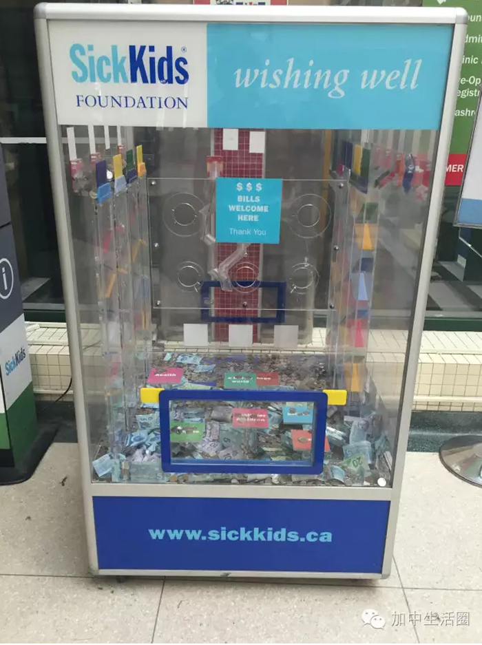 病童医院的门口有一个捐款零钱箱。进门的时候,先生从口袋里掏出一把硬币,哗一下扔进箱子里。里面满满的都是家长们扔进去的零钱,爱心都是这样一点一滴汇聚的。先生说,在北美最好的病童医院得到最好的照顾,一分钱也不用花,靠的都是捐款。