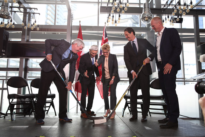 省长韦与加拿大男士健康基金及多伦多枫叶球队等机构的行政人员,以掷冰球开赛的模式宣布省府5年拨款500万元,帮助安省男士提高健康的意识并持之以恒