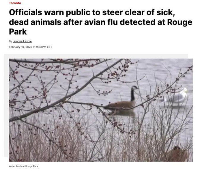 鉴于去年禽流感在全球肆虐,大部分人认为加拿大鹅的异常与禽流感有关。很快,加拿大公园管理局(Parks Canada)于2月10日在社交媒体发布公告称,多伦多红河国家城市公园的一只加拿大鹅确诊感染了H5N1高致病性禽流感,此外还有五例疑似病例。