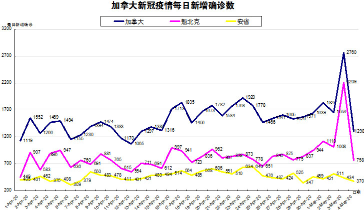 加国生活网小编统计了从4月1日至5月4日每日新增确诊数,制作了如下曲线图,分别统计了全加拿大(蓝色)和确诊数最多的两个省魁北克省(粉色)和安省(黄色)三组数据,大家可以了解一下进行4月份以来加拿大新冠疫情的发展趋势。加拿大、魁省在5月4日新增确诊数又陡然下降,而安省也下降到400以下,期盼着这过山车般的数据在本周会有所变化!