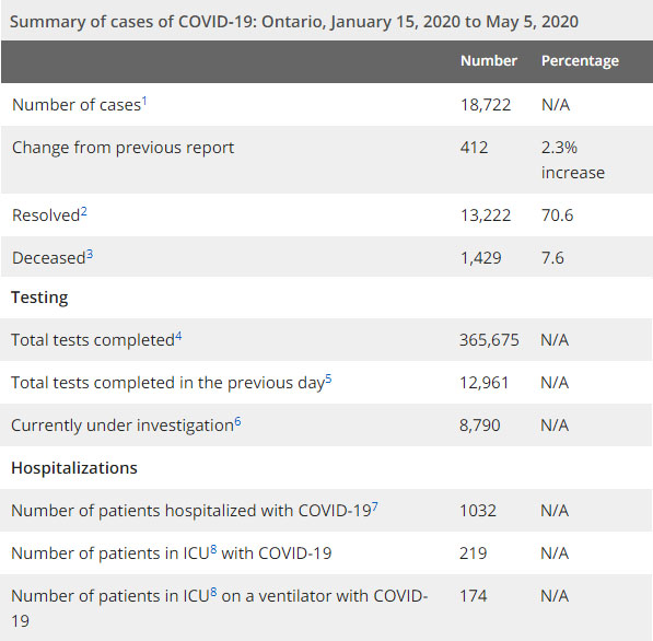 安省方面,截止5月5日上午10:30点,安省已对365675行了新冠病毒检测(检测数较昨天新增12961例),还有8790处于被调查阶段。确诊总数为18722例(比昨天增加了412,确诊率下降仍到3.2%),包括13222例康复、1429例死亡(截止5月6日死亡又增加到1545例,这是CBC统计的最新死亡数据,死亡人数较昨天增加60例,死亡率上升到8.3%,且仍是加拿大死亡率最高省份)、住院患者1032例(减少11)、进入ICU患者219例(减少4)、ICU插呼吸机患者174例(增加8)。