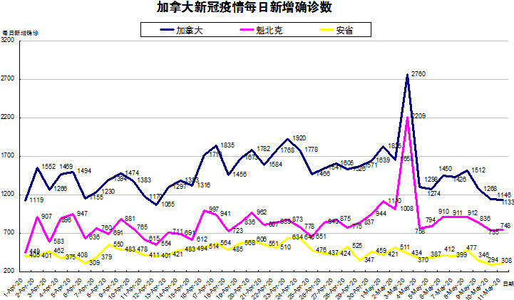 加国生活网小编统计了从4月1日至5月11日每日新增确诊数,制作了如下曲线图,分别统计了全加拿大(蓝色)和确诊数最多的两个省魁北克省(粉色)和安省(黄色)三组数据,大家可以了解一下进行4月份以来加拿大新冠疫情的发展趋势。加拿大在5月11日新增确诊数小幅下降,而魁省和安省则小幅上升。