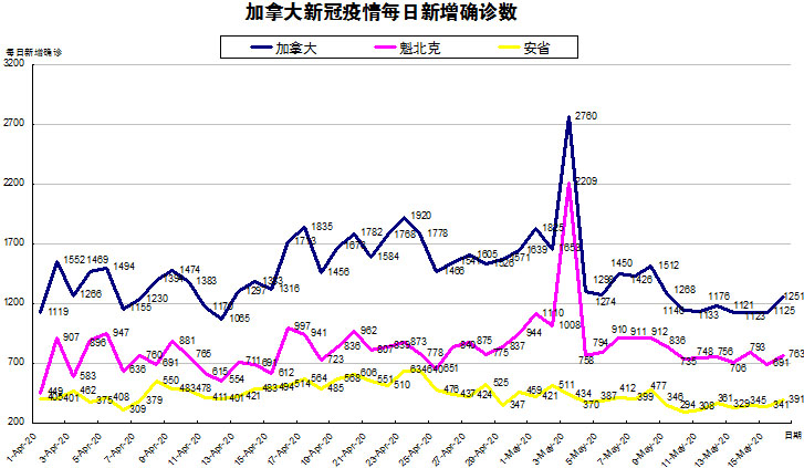 加国生活网小编统计了从4月1日至5月16日每日新增确诊数,制作了如下曲线图,分别统计了全加拿大(蓝色)和确诊数最多的两个省魁北克省(粉色)和安省(黄色)三组数据,大家可以了解一下进行4月份以来加拿大新冠疫情的发展趋势。加拿大、魁省、安省在5月16日新增确诊数均有一定程度的上升。