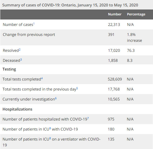 安省方面,截止5月15日上午10:30点,安省已对528609行了新冠病毒检测(检测数较昨天新增17768例),还有10565处于被调查阶段。确诊总数22313(较昨天上升391,确诊率上升到2.2%),包括17020例康复(康复率达到76.3%)、1858例死亡(截止5月16日死亡又增加到1961例,这是CBC统计的最新死亡数据,死亡人数较昨天增加34例,死亡率仍8.8%,但仍是加拿大死亡率最高省份)、住院患者975例(减少11)、进入ICU患者180例(增加1)、ICU插呼吸机患者135例(未变)。