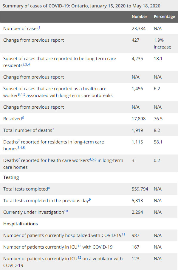 安省方面,截止5月18日上午10:30点,安省已对559794行了新冠病毒检测(检测数较昨天新增5813例),还有2294处于被调查阶段,这两个数字都明显减少。确诊总数23384(较昨天新增427,确诊率爆升到7.3%),包括17898例康复(康复率达到76.5%)、1919例死亡(截止5月19日死亡又增加到2018例,这是CBC统计的最新死亡数据,死亡人数较昨天增加13例,死亡率又下降一点点至8.6%,但仍是加拿大死亡率最高省份)、住院患者987例(增加15)、进入ICU患者167例(减少7)、ICU插呼吸机患者123例(减少10)。