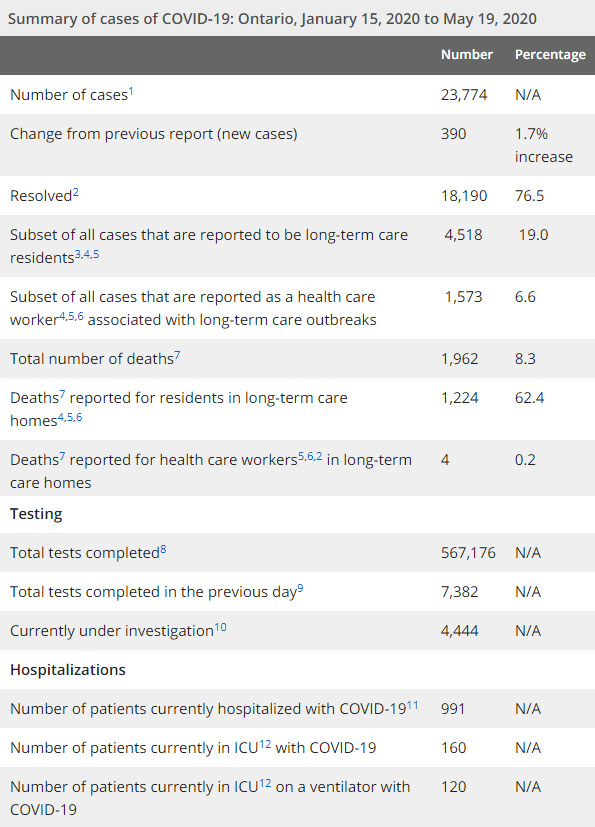 安省方面,截止5月19日上午10:30点,安省已对567176行了新冠病毒检测(检测数较昨天新增7382例),还有4444处于被调查阶段。确诊总数23774(较昨天新增390,确诊率下降到5.3%),包括18190例康复(康复率达到76.5%)、1962例死亡(截止5月20日死亡又增加到2067例,这是CBC统计的最新死亡数据,死亡人数较昨天增加49例,死亡率升高至8.7%,且仍是加拿大死亡率最高省份)、住院患者991例(增加4)、进入ICU患者160例(减少7)、ICU插呼吸机患者120例(减少3)。