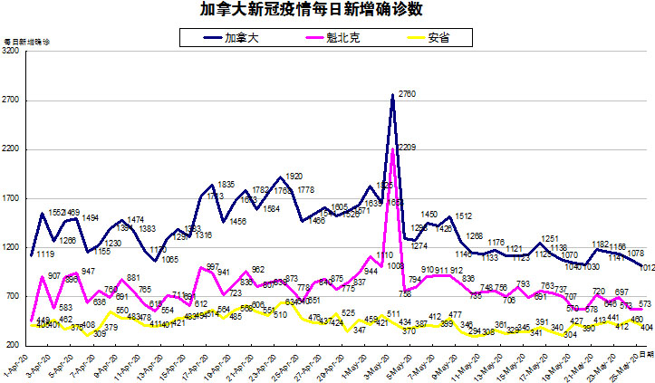 加国生活网小编统计了从4月1日至5月25日每日新增确诊数,制作了如下曲线图,分别统计了全加拿大(蓝色)和确诊数最多的两个省魁北克省(粉色)和安省(黄色)三组数据,大家可以了解一下进行4月份以来加拿大新冠疫情的发展趋势。加拿大、魁省、安省在5月25日新增确诊数均有下降,安省当日新增404例,已连续第五天超过400例,仍处于上升趋势中。