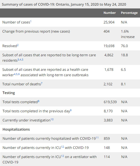安省方面,截止5月24日上午10:30点,安省已对619539行了新冠病毒检测(检测数较昨天新增8170例),还有3883处于被调查阶段。确诊总数25904(较昨天新增404,确诊率上升至4.9%),包括19698例康复(康复率下降至76%)、2102例死亡(截止5月25日死亡又增加到2194例,这是CBC统计的最新死亡数据,死亡人数较昨天增加30例,死亡率仍为8.5%,且仍是加拿大死亡率最高省份)。好消息继续保持的是:住院患者859例(减少19,继续低于900例,这不仅为本周最低,也是本月最低,因为本月几乎天天超过900例);进入ICU患者148例(未变);ICU插呼吸机患者114例(增加10例)。