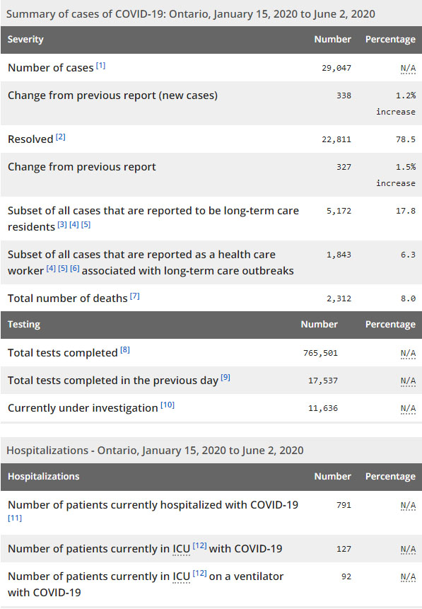 安省方面,截止6月2日上午10:30点,安省已对765501行了新冠病毒检测(检测数较昨天新增17537例,这是进入6月以来首日达到1.6万测试目标),还有11636处于被调查阶段。确诊总数29047(较昨天新增338,确诊率下降至1.9%),包括22811例康复(康复率上升至78.5%)、2312例死亡(截止6月3日死亡又增加到2373例,这是CBC统计的最新死亡数据,死亡人数较昨天增加17例,死亡率仍为8.2%)。住院患者791例(减少10例);进入ICU患者127例(增加2);ICU插呼吸机患者92例(增加5)。