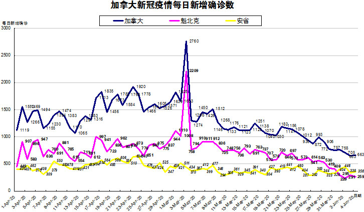 加国生活网小编统计了从4月1日至6月4日每日新增确诊数,制作了如下曲线图,分别统计了全加拿大(蓝色)和确诊数最多的两个省魁北克省(粉色)和安省(黄色)三组数据,大家可以了解一下进行4月份以来加拿大新冠疫情的发展趋势。6月4日,加拿大新增确诊数虽略微上升至663,但属于连续2日低于700以下的趋势;魁省较昨天有所下降,总体趋势仍保持下降趋势;安省虽较昨日有所上升,总体趋势也仍是上升,且目前仍是当日确诊数最多的省份!