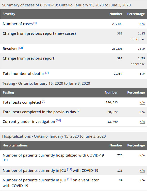 再看看安省方面的详细数据,截止6月3日上午10:30点,安省已对786323行了新冠病毒检测(检测数较昨天新增20822例,这是进入6月以来首日超到2万测试目标),还有12760处于被调查阶段。确诊总数29043(较昨天新增356,确诊率下降至1.7%),包括23208例康复(康复率上升至78.9%)、2357例死亡(截止6月4日死亡又增加到2419例,这是CBC统计的最新死亡数据,死亡人数较昨天增加46例,死亡率仍为8.2%)。住院患者776例(减少15例);进入ICU患者121例(减少6);ICU插呼吸机患者94例(增加2)。