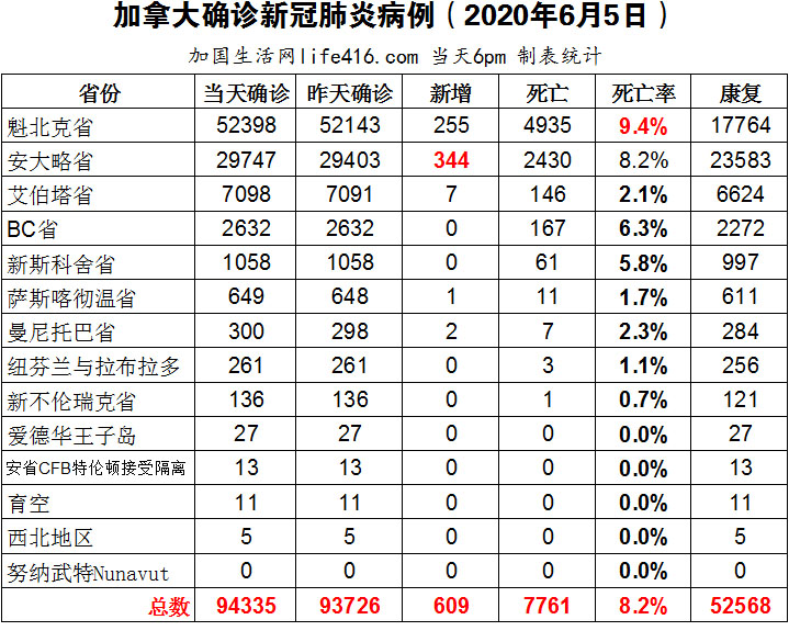 【加国生活网编译报道】截至6月5日下午6点,加拿大确诊新冠病例总数94335(新增609,连续3日低于700以下),死亡7761。魁省确诊总数52398(当日新增255),死亡4935,死亡率9.4%仍为加拿大死亡率最高省份。安省确诊总数29747例(当日新增344,仍为加拿大当日确诊数最高省份),死亡总数2430例(当日新增11例),死亡率仍为8.2%。联邦和安省政府将收集基于种族的新冠疫情相关数据;安省省长下周宣布重启第二阶段时间表。加国生活网专门制作了如下统计数据表: