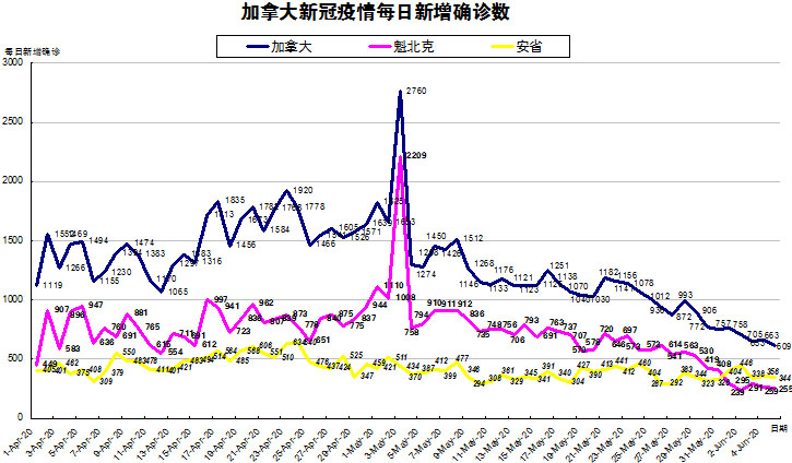 6月2日:加拿大新增病例连续四天低于800 安省却逆势反弹至446