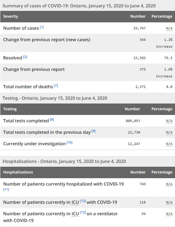 再看看安省方面的详细数据,截止6月4日上午10:30点,安省已对809053行了新冠病毒检测(检测数较昨天新增22730例,这是进入6月以来连续2日超过2万测试目标),还有12247处于被调查阶段。确诊总数29747(较昨天新增344,确诊率下降至1.5%),包括23583例康复(康复率上升至79.3%)、2372例死亡(截止6月5日死亡又增加到2430例,这是CBC统计的最新死亡数据,死亡人数较昨天增加11例,死亡率仍为8.2%)。住院患者749例(减少27例);进入ICU患者118例(减少3);ICU插呼吸机患者94例(未变)。
