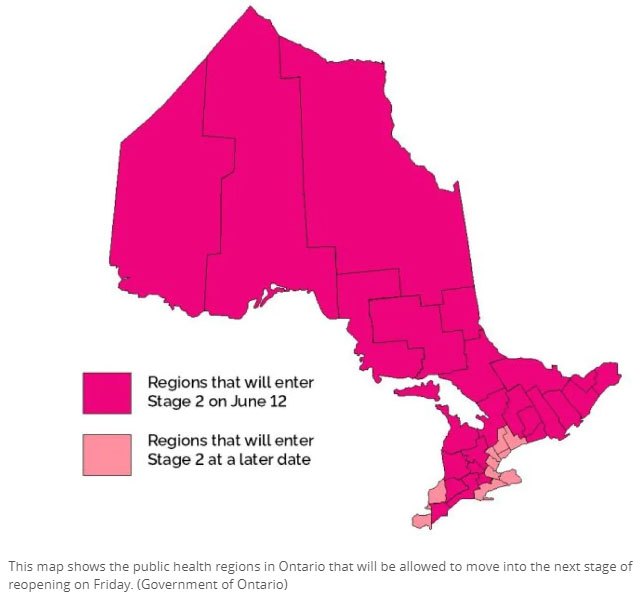 —— 安省省长福特在6月8日新闻发布会上概述了安省经济重启第二阶段的一些细节:从6月12日起,安省34个公共卫生单位中的24个将被允许进入第二阶段,其余10个主要集中在大多伦多地区、汉密尔顿地区(GTHA)以及美国和加拿大边境附近的公共卫生单位,则需要等到每日新增确诊病例数持续减少后才能进入第二阶段,不过福特亦表示将每周对此决定进行审查。