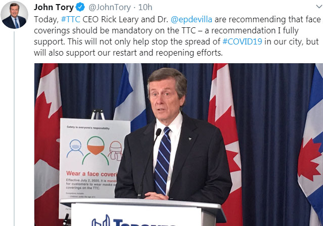 —— 多伦多市长庄德利(John Tory)在6月11日宣布了多伦多TTC的一项最新规定:从7月2日起,强制要求所有乘坐TTC的乘客佩戴口罩或面罩。TTC首席执行官Rick Leary也表示他支持该计划,不过,此项规定最终还需要TTC董事会在下周的会议上批准。