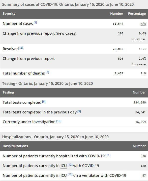 再看看安省方面的详细数据,截止6月10日上午10:30点,安省已对924680行了新冠病毒检测(检测数较昨天新增24341例),还有16359处于被调查阶段。确诊总数31544(较昨天新增203,确诊率下降至0.8%),包括25885例康复(康复率为82.1%)、2487例死亡(截止6月11日死亡又增加到2543例,这是CBC统计的最新死亡数据,死亡人数较昨天增加8例,首日低于10例,死亡率仍为8.1%)。住院患者538例(减少42例,连续2日少于600以下);进入ICU患者120例(增加2);IU插呼吸机患者87例(增加1)。