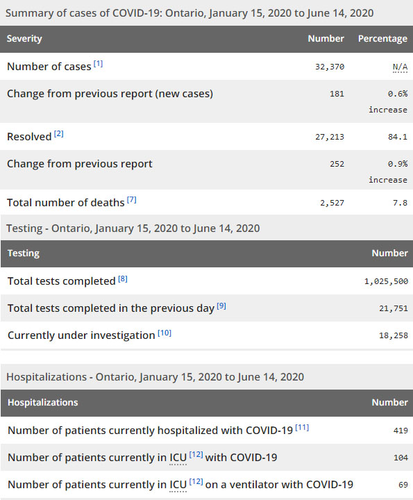 再看看安省方面的详细数据,截止6月14日上午10:30点,安省已对1025500例行了新冠病毒检测(检测数较昨天新增21751例),还有18258处于被调查阶段。确诊总数32370(较昨天新增181,确诊率下降至0.83%),包括27213例康复(康复率为84.1%)、2527例死亡(截止6月15日死亡又增加到2579例,这是CBC统计的最新死亡数据,死亡人数较昨天增加8例,死亡率仍为8.0%)。住院患者419例(减少19例,连续3日少于500以下);进入ICU患者104例(增加1);IU插呼吸机患者69例(减少8)。