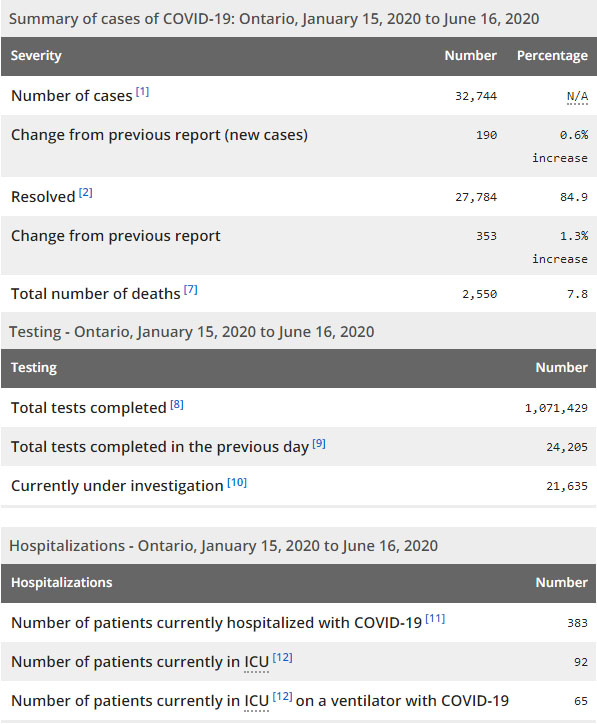 再看看安省方面的详细数据,截止6月16日上午10:30点,安省已对1071429例行了新冠病毒检测(检测数较昨天新增24205例),还有21635处于被调查阶段。确诊总数32744(较昨天新增190,确诊率下降至0.78%),包括27784例康复(康复率为84.9%)、2550例死亡(截止6月17日死亡又增加到2603例,这是CBC统计的最新死亡数据,死亡人数较昨天增加8例,死亡率下降为7.9%)。住院患者383例(减少30例,首日少于400以下);进入ICU患者92例(减少6);IU插呼吸机患者65例(减少5)。