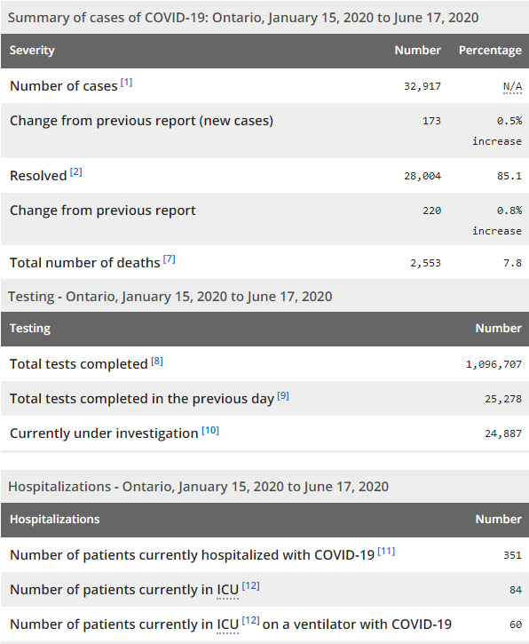 再看看安省方面的详细数据,截止6月17日上午10:30点,安省已对1096707例行了新冠病毒检测(检测数较昨天新增25278例),还有24887处于被调查阶段。确诊总数32917(较昨天新增173,确诊率下降至0.68%),包括28004例康复(康复率为85.1%)、2553例死亡(截止6月18日死亡又增加到2605例,这是CBC统计的最新死亡数据,死亡人数较昨天增加2例,死亡率为7.9%)。住院患者351例(减少32例,连续2日少于400以下);进入ICU患者84例(减少8);IU插呼吸机患者60例(减少5)。